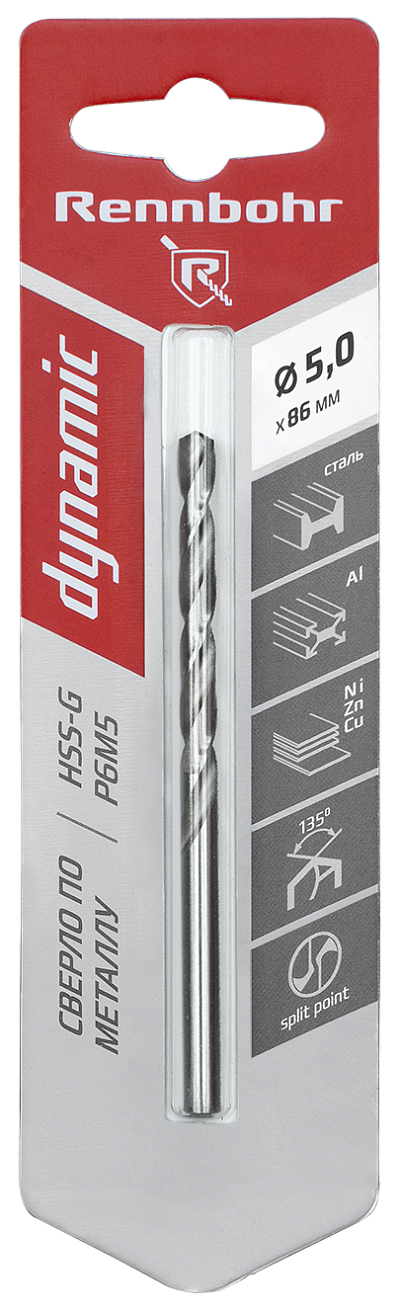 Сверло по металлу 5,0 х 86 мм HSS-G, P6M5 RENNBOHR DYNAMIC CARD ЦХ (1шт)